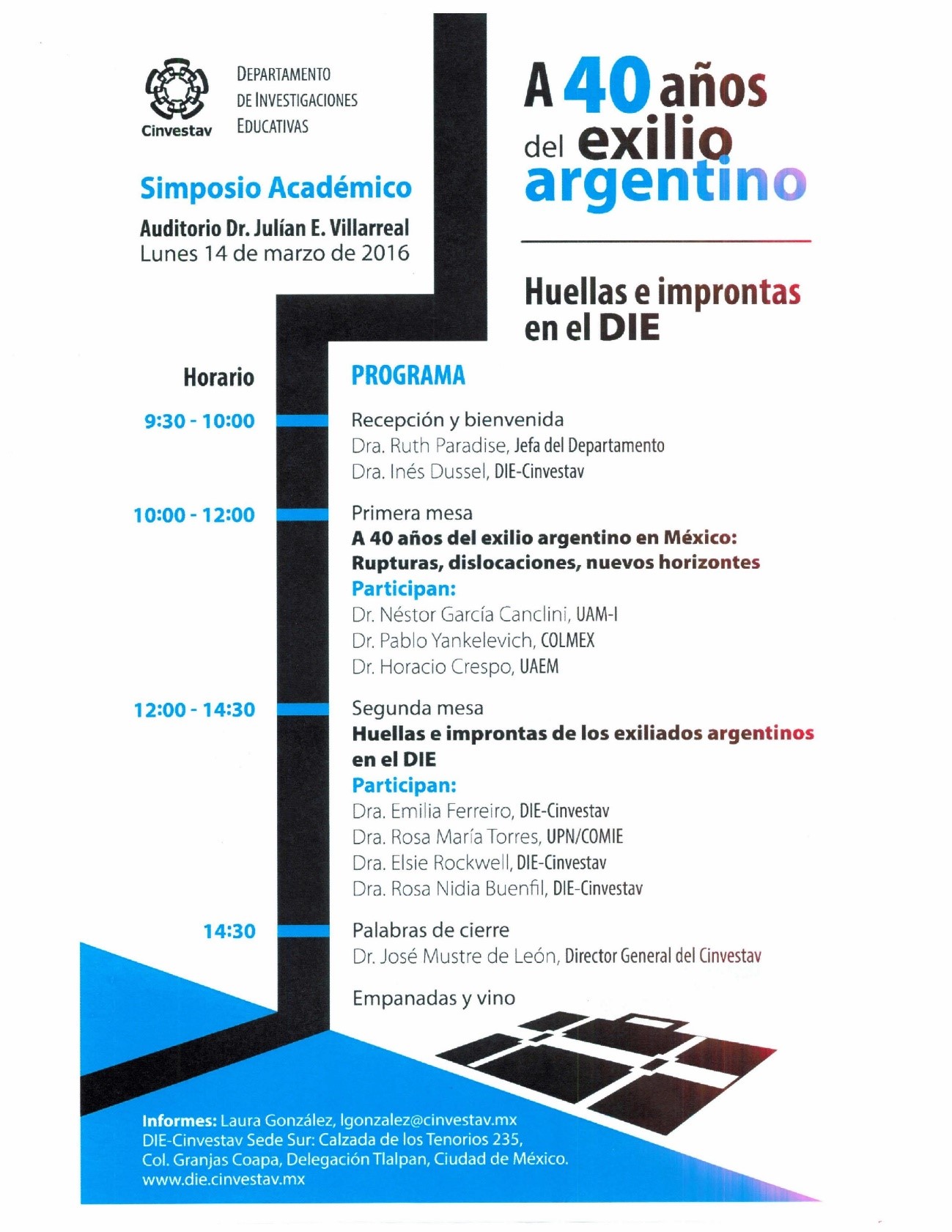 Organizado por el Departamento de Investigaciones Educativas del Cinvestav-IPN, el próximo lunes 14 de marzo de 2016 en el Auditorio Dr. Julían E. Villareal tendrá lugar el simposio académico «A 40 años del exilio argentino».